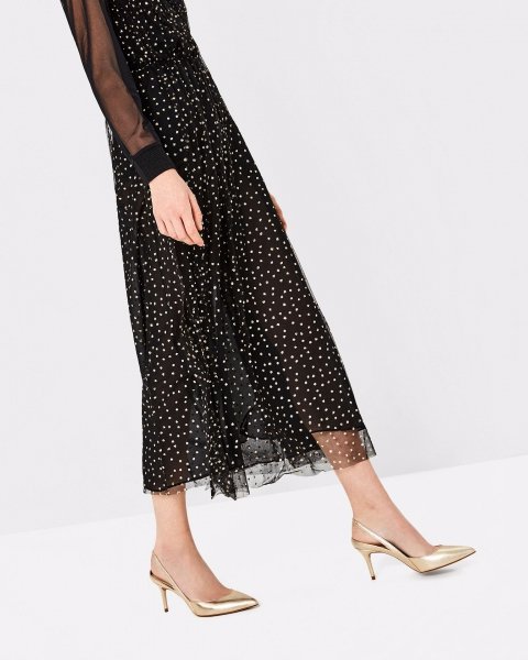 This pair of pointy slingback shoes were made to party. Wear these to a party, work, and play. The gold color adds a touch of glam to any outfit.